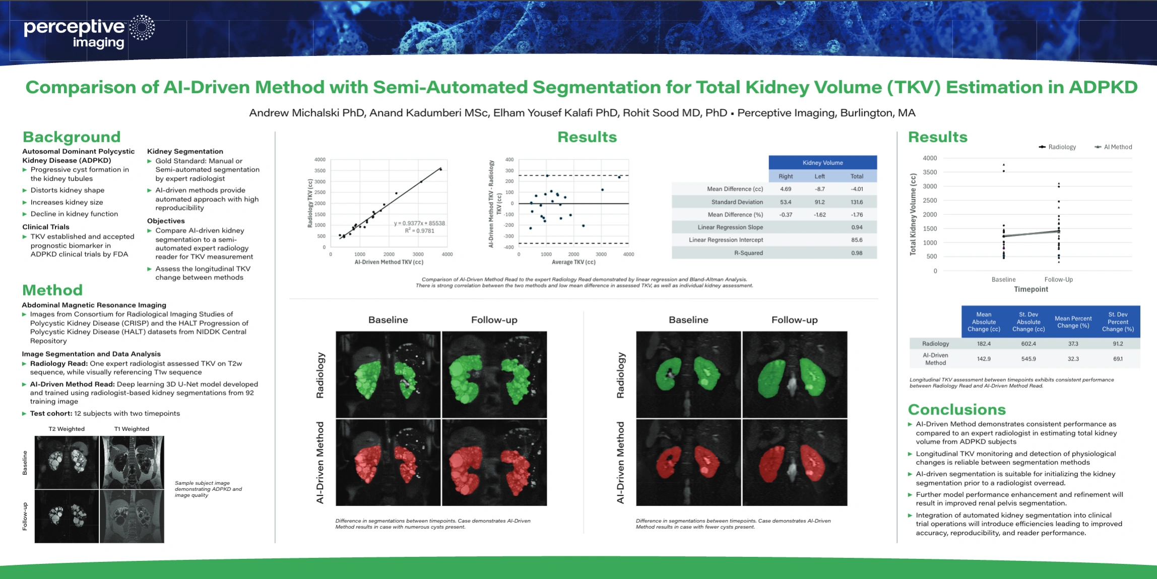 This poster, which was presented at the American Society of Neurology (ASN) 2025 Kidney Week meeting, compares an artificial intelligence (AI)-driven method with semi-automated expert radiologist segmentation for estimating Total Kidney Volume (TKV) in patients with Autosomal Dominant Polycystic Kidney Disease (ADPKD). Using MRI data from major clinical datasets, the study demonstrates that the AI model achieves highly consistent results with expert radiologists, both in single timepoint and longitudinal TKV assessments. The findings show strong correlation and minimal mean difference between methods, supporting the use of AI-driven segmentation as a reliable, reproducible, and efficient tool for TKV measurement in clinical trials. The poster concludes that integrating automated segmentation into clinical trial operations can enhance accuracy, reproducibility, and workflow efficiency, while also supporting expert review when needed.