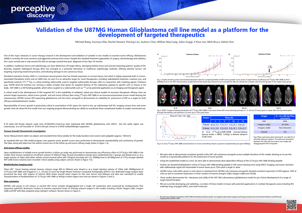 Glioblastoma (GBM) remains one of the most aggressive and treatment-resistant brain tumors, underscoring the need for translational preclinical imaging models that accurately reflect tumor biology. This EORTC 2025 poster presents a validated U87MG glioblastoma xenograft model expressing fibroblast activation protein (FAP), a promising target for radioligand therapy (RLT). Using [¹⁷⁷Lu]Lu-FAP-2286, Perceptive Discovery demonstrates reproducible tumor growth, dose-dependent efficacy, and sustained tumor retention visualized through SPECT imaging up to 72 hours post-dose. These findings establish the model as a reliable preclinical platform for evaluating FAP-targeted imaging agents, radiopharmaceuticals, and other targeted therapies, bridging preclinical insights to early clinical translation.